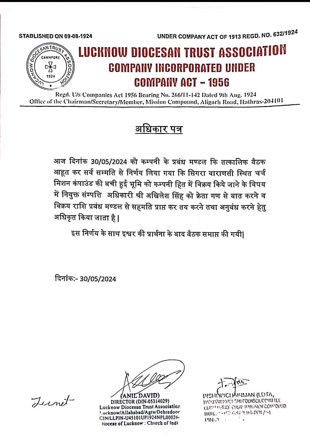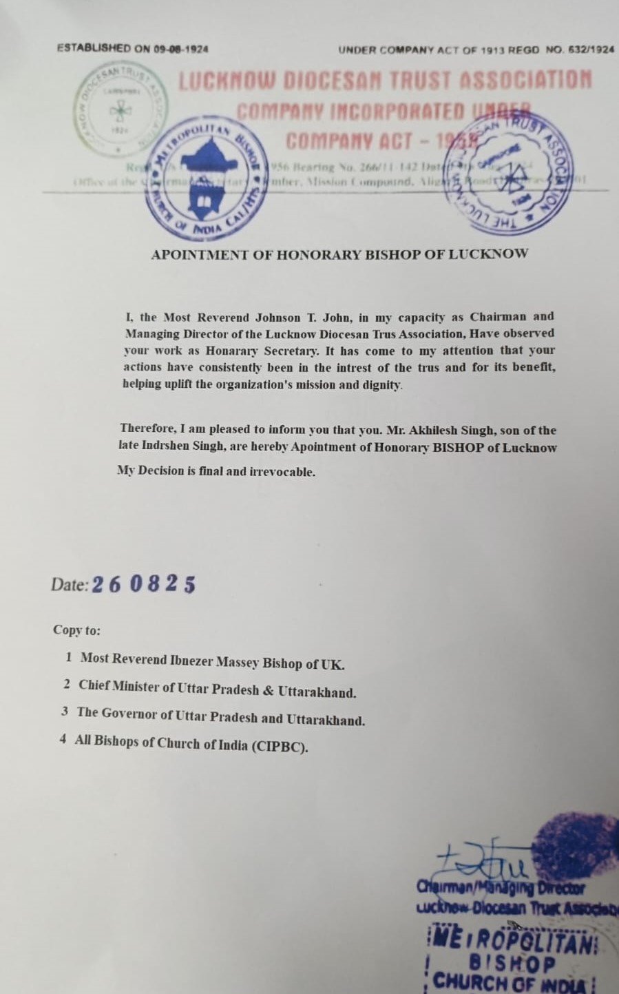 This fake letter was also made by Mr. Akhilesh Singh claiming himself as the Bishop of Lucknow which is totally Fake. As the appointment of bishop takes more than 3 bishops and it doesn’t done on the letter pad of the company and most importantly a Christian man can only become bishop. After the termination of Akhilesh Singh from the post of care taking secretary he has gone completely crazy he fabricated this letter to do more fraud things.